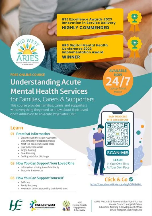 We are delighted to announce that our online self-paced course ‘Understanding Acute Mental Health Services for Families, Carers and Supporters’ has been shortlisted and selected to advance to the next stage in the HSE Excellence Awards in the ‘Innovation in Service Delivery’ category.